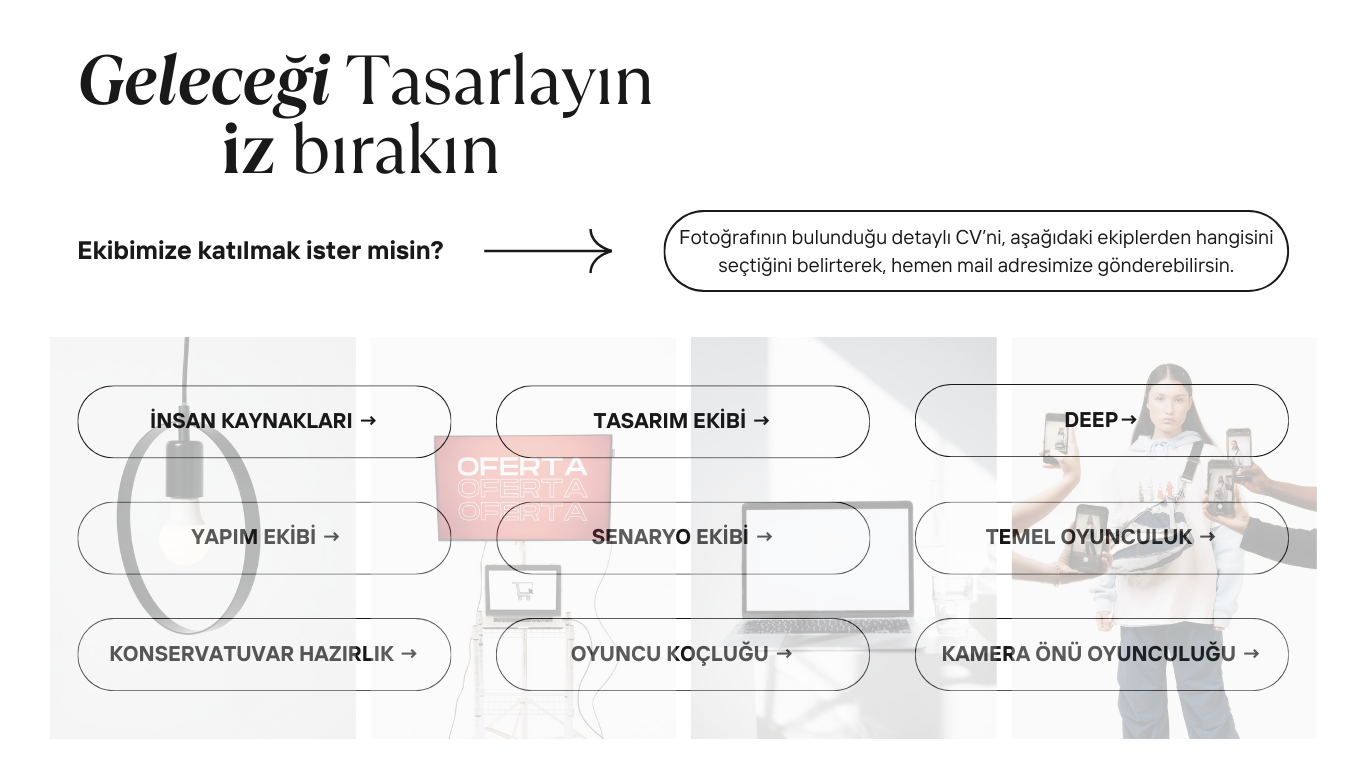 Dizi ve sinema sektörlerinin en ihtiyaç duyduğu sanatçıya merhaba! Hayal gücünün sınırsızlığı seni çağırıyor! Bende varım diyorsan oyuncumuz olabilir, yaptığımız projelerde oynayabilirsin!